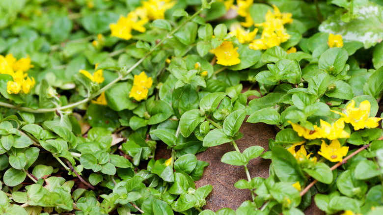 Weeds that spread primarily by runners (stolons), along the top of the soil, or by roots (rhizomes), below the soil surface, are harder to extract. Among the runners are many types of grasses, such as Bermuda grass (Cynodon dactylon) and creeping bentgrass (Agrostis stolonifera). Other "creepers" include creeping Jenny (Lysimachia nummularia) and creeping Charlie (Glechoma hederacea), both very difficult to eradicate once they're established. Weeds that spread by rhizomes can be even more difficult to remove. These include Canadian wild ginger (Asarum canadense), Japanese knotweed (Reynoutria japonica), and quackgrass (Elymus repens), all notorious weeds because they create widespread root systems that can crowd out other plants.