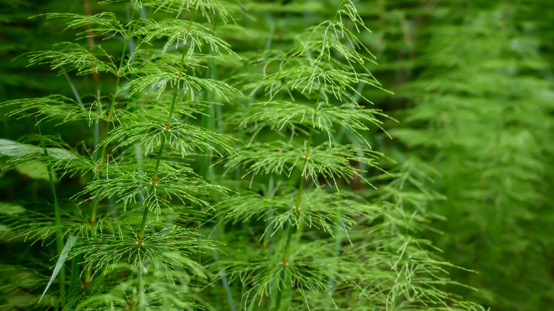 While this fern-like weed is native to North America, horsetail (Equisetum arvense) is not the addition to the yard you'd want near your home. It's an ancient weed that's incredibly difficult to eradicate, with creeping rhizomes that can grow as deep as seven feet below the surface. Once bent on spreading, it can grow rapidly and is even pernicious and strong enough to grow through asphalt. If cultivated and kept trimmed in a pot, horsetail plants can lend a decorative air to porches, but if grown in your landscape, it can make the porch its playground.