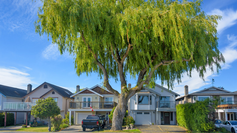 Willows (Salix) are another mighty tree that's beautiful to look at it, but has an expansive and destructive root network. These roots crave water in a big way, so they will travel towards water sources and grow larger in that vicinity. This includes pools, pipes, and landscaped ponds alike, meaning the roots will travel towards those things and disrupt or damage the surrounding structures as a result. Willows, therefore, should be planted at least 50 feet away from those elements. There are also structural growth problems with willow varieties too, including brittle branches that can drop on houses and cause clutter.
