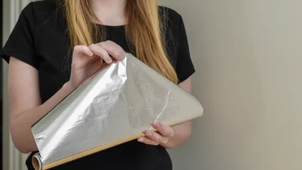 To line shelves with aluminum foil, begin just as you lay any other contact paper. Start by removing everything from the shelf or drawer. Remove old contact paper from the wood surfaces and clean it to ensure the surface is free of grease or dirt. If the surface is rough, sand it a little with sandpaper to smooth it. Measure the aluminum foil to fit the drawer or shelf. Use double-sided tape to adhere it. Wood Fixes offers a few other ways to adhere shelf liner to a wood surface, but tape may be the easiest to remove later if you need to. You can also achieve the same effect by using a self-adhesive aluminum foil shelf paper, like this one at Walmart ($12.92) that comes in several designs.