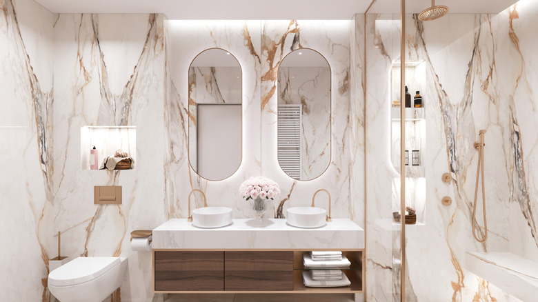 HGTV stars of "Property Brothers," Drew and Jonathan Scott, have highlighted many ways to improve the appearance of your home, but one thing that they claim is a surefire way to raise the price is by using large slabs of porcelain tile. While the material may initially bring to mind porcelain dishware — or another bathroom staple, the porcelain throne i.e. toilet — there is a reason that these two heavy-use items are made with porcelain; it is incredibly durable. Resistant to stains, scratches, chips, and about any other damage you can think of, porcelain is a material that is built to last. These oversized tiles may be a bit pricey but they can make a stunning statement in your bathroom and give it a sleek, high-end appearance that will last for decades.