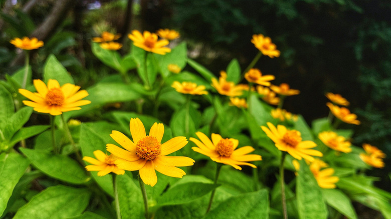 Butter daisy (Melampodium divaricatum) is an annual hardy in zones 2 to 11. It does best in full sun in a wide range of well-draining, occasionally dry soil, and is both heat- and drought-tolerant. It produces yellow daisy-like flowers that can bloom from May until the first frost. Goldfinches and other songbirds will enjoy its seeds. Its close cousin is the perennial Blackfoot daisy (Melampodium leucanthum), hardy in zones 6 to 10. Blackfoot daisy can also be a nice hanging plant, though it does not trail like butter daisy.