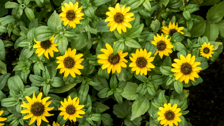 Creeping zinnia (Sanvitalia procumbens) is an annual native to Mexico and hardy in zones 2 to 11. In a hanging basket, it will form low-growing mats that can trail over the side. It flowers best in full sun, where it produces an abundance of small yellow flowers throughout the growing season. Plant it in well-draining soil that is dry to moderately moist. Being heat- and drought-tolerant, creeping zinnia does not appreciate being over-watered.
