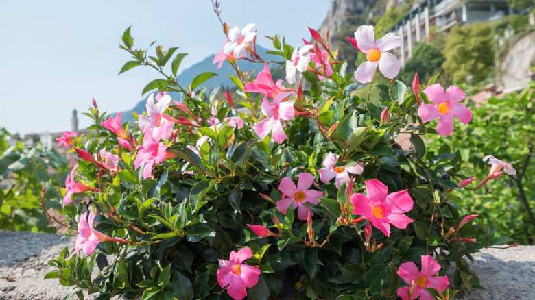 Mandevilla (Mandevilla spp.) is a gardener's favorite that can grow up to 10 feet long. It's a perennial native to Central and South America that is hardy only in zones 10 and 11, but you can bring it indoors before the first frost. Caring for a mandevilla vine is relatively straightforward: it likes full sun with moist, well-draining soil, and profits from a liquid fertilizer every few weeks.