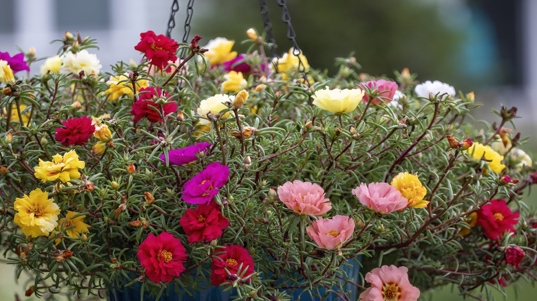 Moss rose (Portulaca grandiflora) is a popular ground cover that also makes for a great hanging plant. It's a low-growing annual hardy in zones 2 to 12. Tolerant of both heat and drought, it forms a mat of ruffled flowers in many colors. Moss rose thrives in full sun in average soil that drains well and remains on the dry side of moist. It can easily self-sow, so deadhead the flowers if you want to prevent the development of seeds. With appropriate care, you can even care for moss roses in the winter and re-hang them the following spring..