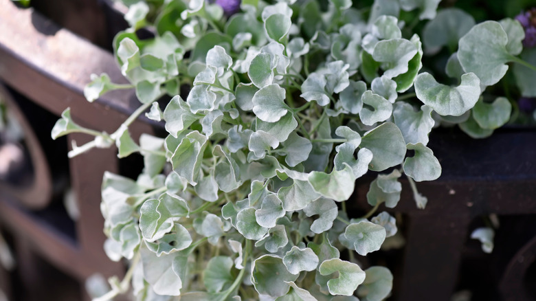 Silver ponysfoot (Dichondra argentea) is a perennial native to Mexico, South America, and the American Southwest. It is hardy only in USDA hardiness zones 10-12, so it is usually grown as an annual. It thrives in full sun and is best known for its silvery leaves rather than its relatively humble pale flowers. It prefers dry to medium, well-draining soil and can put up with both heat and drought. It can drape many feet over the sides of a hanging basket, making for an elegant statement.