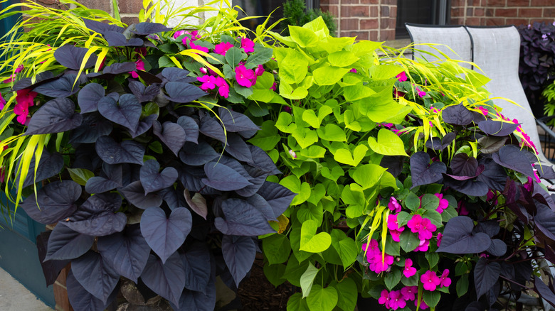 Sweet potato vine (Ipomoea batatas) is a native of Central and South America and comes in either edible or ornamental varieties. Hardy only in zones 9 to 11, its vines can reach up to 10 feet in a growing season. It is grown as an ornamental for its abundant foliage rather than for its edible tubers. Plant it in a hanging basket in rich, well-draining soil and place it in either full sun or part shade. Its flowers attract pollinators.