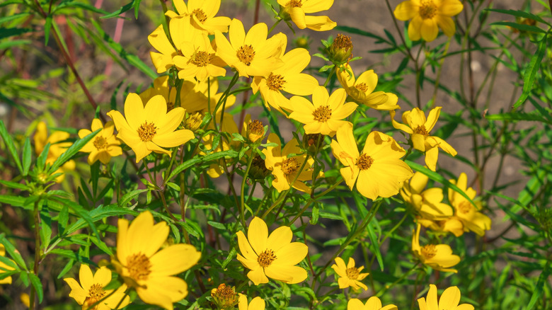Tickseed sunflower (Bidens aristosa) is an annual hardy in zones 5 to 9 that can bloom all summer long. Look for trailing varieties of the plant, which are better suited for hanging baskets. Drought- and heat-tolerant, it needs full sun exposure and soil rich in organic matter to properly produce its yellow, pollinator-friendly flowers. Birds will snack on the seeds once the flowers have lost their bloom. By late summer, you might want to add a liquid fertilizer to your hanging basket to keep the blooms coming.