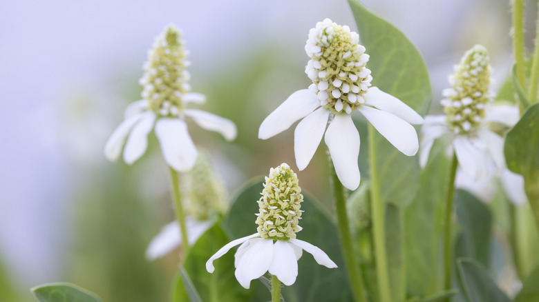 As its botanical name suggests, yerba mansa (Anemopsis californica) is a California native that is hardy in zones 7 to 10. A vigorous perennial in its native wetland habitat, it can be grown safely in hanging baskets without becoming invasive. Just note that its rapid-growing tendency means that it may outgrow a small pot quickly. It tolerates heat but needs full sun and soil that is consistently moist and doesn't dry out. Water frequently, and you'll be rewarded with beautiful, tiny white flowers and stems that turn bright red in the fall after the plant is done blooming.
