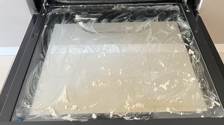 Simply take ¼ cup of baking soda, and add a few drops of dish soap, then mix together to make a paste. If it's too crumbly, add a little more dish soap. Then, using a sponge or cloth, apply the paste to the oven door — be generous here, as you can't really go overboard. Allow the paste to sit for several hours minimum, but overnight preferred. Finally, use a wet cloth to wipe away the paste and any other stains. If baking soda has dried out and fallen to the bottom of the oven, just use a brush and dustpan to get it out.