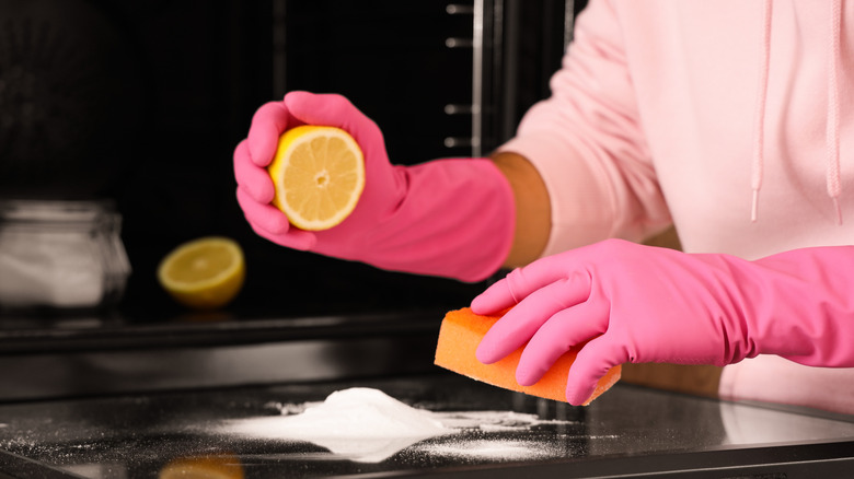 Here's how to try this method: In a baking dish with tall sides, add several inches of water, then put the lemon halves in, cut-side down. Some methods call for lemon slices, but since you'll be baking them, you don't want them to dry up or brown, and the halves will stand up to heat a bit better. Then put the baking dish in your preheated oven for 20 minutes at 400 degrees Fahrenheit. When the time is up, allow the baking dish and the oven to cool down before proceeding. Once cooled, wipe down the door with a damp microfiber cloth, and you should immediately see a layer of grime come up. If that's still not enough and there are more stubborn grease stains, take a fresh lemon half and fine salt and scrub away until the stain comes up. Finally, polish everything with a fresh microfiber cloth.