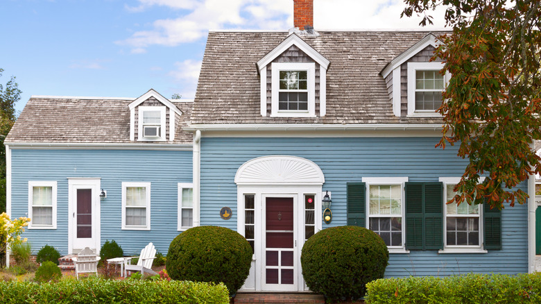 Arguably one of the most versatile options for adding color to your exterior, no matter the design aesthetic, is a grayed-out navy or slate blue. Ranging from mid-tone to deep shades, it's hard to go wrong with a medium to dark blue exterior, especially when complemented and contrasted by a warm light tan roof. These desaturated blue options are earth tones, so they feel tranquil and subtle, but the darker you go, the more calm moodiness you will also create.