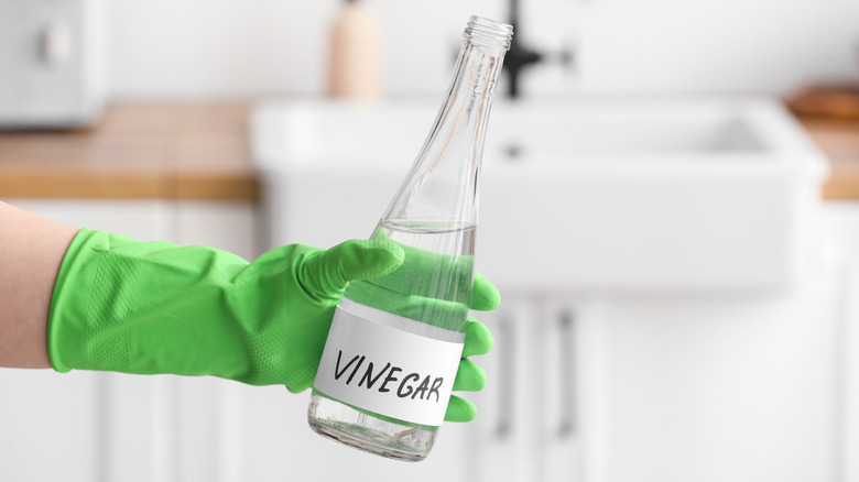 Yellow stains on clothing are most typically caused by reactions between your antiperspirant ingredients, sweat, and bacteria, which is why you'll commonly see these discolorations happen in spots like under the arm on pieces of clothing. It can be quite embarrassing and unsightly, and while you may feel like all hope is lost when you see these spots form, there's one easy pantry staple that will save your laundry from permanent damage: white vinegar. White vinegar's acidic properties draw these stains out; as Scientific American puts it, it's "...like a magnet getting pulled by another magnet."