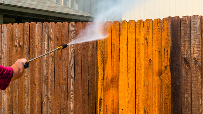 If you choose to go this route, it's important to do a thorough inspection of the panels for holes, splintering, and chipped paint beforehand. These must be fixed before pressure washing to help preserve your fence. Tips for using a pressure washer on a wooden fence also involve picking the correct nozzles for the surface you're wanting to clean. Some experts also claim that you can pressure wash wooden fencing if you use a lower setting, but you will absolutely want to test a panel first and adjust accordingly before moving forward with the entire fence.