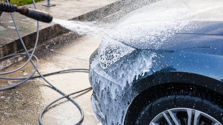 In some cases though, you can still consider pressure washing your vehicle, but you will need to proceed with extreme caution. The big key is to make sure your vehicle is free of chipped paint and other areas of damage beforehand. Another important caveat in this case is the type of pressure washer you have. If you're set on trying this method, consider an electric pressure washer exclusively, since these have lower PSI settings compared with gas versions. Also, take care not to point the nozzle too close to the vehicle, as this might increase the risk of damage. Aim for a distance of at least 2 feet away, and always use a fan-shaped nozzle for a gentler outcome.