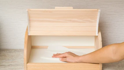 Breadboxes were once a common fixture in kitchens because they keep bread fresh for several days. Before the days of sliced bread in plastic packaging, crusty loaves of bread were stored in wooden boxes that kept the mice out and moisture in. They were often made of wood, which was breathable and allowed some moisture to escape, and that kept the crust crisp. When bread began to be sold in plastic, breadboxes began falling out of favor in American kitchens. However, they never really went away. Breadboxes are still great for storing bread, and can be a stylish solution for hiding spices or other kitchen items while adding a charming element to the kitchen décor. Plus, having a super cute breadbox might be the perfect reason to try this 2-ingredient recipe that proves baking fresh bread can be easy.