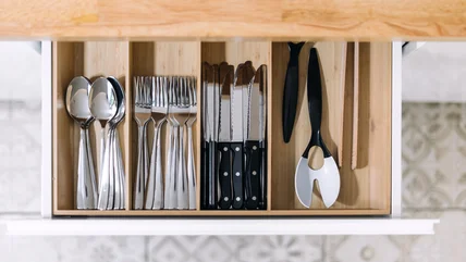 Head to your favorite store to buy organizers with drawer template(s) in tow. Lay the parchment down on the floor so you can simulate various organizer configuration options. The template will help you visualize and space plan the end result to ensure the dimensions will work with your drawer before you leave the store. Once you're happy with the final layout, purchase your new organizers with confidence, bolstered by the peace of mind that they will fit beautifully in your space. This technique not only works perfectly for organizing utensil and silverware drawers in the kitchen, but also for templating drawers for storage in the bathroom, office, craft room, and more. The next time you need to optimize and organize your kitchen's drawers, come prepared with a full-scale parchment paper template to take all of the guesswork out of which organizers will fit best for the perfectly compartmentalized storage system of your dreams!