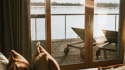 Some folks get concerned that matching your curtains to your furniture and to your walls is a bit too matchy-matchy, but when executed right, it can make a room look chic. Coupled with an expansive sliding glass door, the monochromatic look will appear effortlessly chic. Consider going neutral to avoid overly-matching fears, and bear in mind that not all neutrals are created equal. Some neutral colors like Pantone's color of the year in 2025, Mocha Mousse, add depth and richness to the space without overwhelming it.