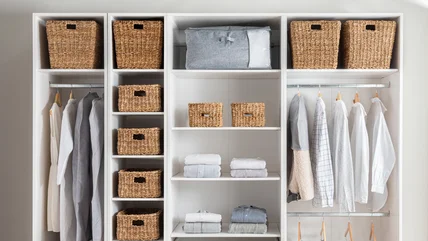 Once the burlap is cut, you can start hot-gluing the fabric down to the bottom of the bin, wrapping all the way around. When you reach your starting point, fold the edge of the side coming around and hot glue it down to create a smooth seam. Then, tuck the excess burlap into the overhang of the basket to hide it. You will also want to make sure the fabric is pressed and glued tightly to the edge on the bottom, so you may have to touch it up when you're done. Once everything is glued, your baskets are ready to organize your home. If you are craving more basket organization for cheap, you can reorganize kitchen towel chaos with these Dollar Tree baskets.