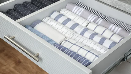 Your kitchen towels can cause quite the headache when it comes to trying to keep them tucked away neatly and efficiently, as they can end up being quite bulky and problematic in your drawers. This issue is only made worse when you have shallow drawers, as most methods that you might try to store kitchen towels end with fabric getting caught on the frame of the drawer, not allowing it to close properly. If you are trying to best organize space in your drawers, there are several particular methods of folding your kitchen towels so they fit nicely and make space for more.