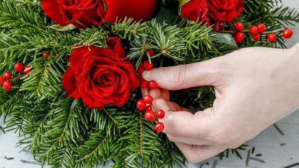 You can build your festive centerpiece in a matter of minutes, with the pool noodle acting as floral foam. Slice the noodle a few inches taller than the vase and position it in the center of the vessel. Surround it with ornaments, which will help hold it in place. Keep filling the vase until the ornaments almost reach the top. Then, push the stems of your florals into the foam, making sure to cover any part of it that's not hugged by ornaments. Alternate bits of faux pine or cedar with pieces of vining greenery for an appealing blend of shapes and textures. Soon, you'll have the perfect festive centerpiece for your Christmas dinner table. Have a few supplies left over? Try your hand at one of these other creative DIY Christmas decorations.