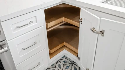 Lazy Susans in corner kitchen cabinets are anything but lazy. They enable you to store your kitchen essentials neatly on that magical, spinning, two-tier circular shelving unit that prevents you from having to reach too far back for that mixing bowl or pitcher. But sometimes as you pile stuff onto your lazy Susan slots, you might ask yourself if you could be using that space more efficiently. It seems like there are corners in the back that are going unused. Maybe this Susan is lazy after all. It might be time for a solution that gives you space to store that long pancake griddle or other unusually shaped pots and pans. Enter the return of shelves to maximize cupboard room.