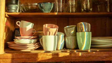 When coffee cup collections become too big, picking out the ones you don't use often and relocating them frees up cabinet space. Place one or two of Dollar Tree's $1.25 collapsible bins on the top shelf of your cupboard to keep your mugs hidden yet nearby. You could also have them hold extra mugs in your pantry so that they're organized and out of the way. Either way, they'll add a decorative touch wherever they go, as the fabric containers come in a variety of colors and patterns. Just tuck some cardboard between your coffee cups to prevent them from clinking together and breaking.
