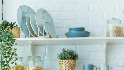 The way this project works is by taking a towel bar that would normally be fixed to a wall, and flipping it 90 degrees to install against the top outer edge of a floating shelf. Depending on the length of the ledge, you may need several of these to make the look work, but it's worth it for a few reasons. One is that this hack helps determine how to incorporate open shelving without sacrificing a clutter-free look, as the bars rein in some of the space available on the shelves. Rather than stacking knickknacks all the way to the edge, you've got to consider how to space them out in within the allotted area of the bar. It's also nice for keeping your valuables from falling off those open ledges, especially if one isn't quite level.