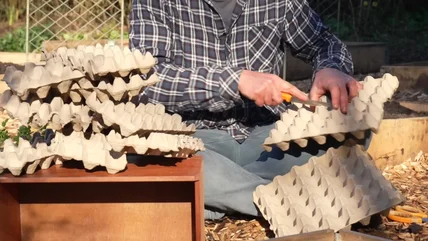 As long as you have the right filler material, like a paper-based egg carton, lining a flowerpot or planter is very straightforward. Cut up the material with a pair of shears or boxcutter, or rip it up by hand if it's weak enough. Soak the pieces in some water, and use them to line the bottom of a plant pot. Once this layer is placed, pile the soil and plant on top. When made entirely of biodegradable material, they take between a few weeks to around six months to decompose. This timeline is perfect for supporting young annual plants, which go through their entire lifecycle in just one year.