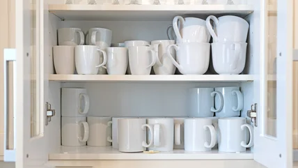 Most of the materials you need for this crafting project are relatively inexpensively at your local craft store or online. A small pallet like Vintiquewise 13-Inch Rustic Wooden Pallet and a simple wood board (e.g., a 1-by-8) to act as the shelf will form the main structure. Then, you just need some hooks to hold your cups on the pallet, a pair of small L brackets (like these Bonsicoky L Brackets), and decorations. In the original DIY, Raposo uses a miniature paint roller and a small paintbrush to apply a coat of sky blue multi-surface paint, but you can use any color you'd like. For wood projects, oil-based paint, milk paint, chalk paint, latex paint, or acrylic are all good choices. Finishing it up, a decoupaged pattern across the front surface creates a stylish and eye-catching backdrop to show off your favorite mugs.